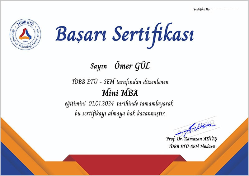 Mini MBA Programı, Türk iş dünyasına en yakın üniversite olan TOBB Ekonomi ve Teknoloji Üniversitesi’nin güçlü akademik kadrosunun bilgi ve deneyimleriyle hazırlanmıştır. Mini MBA Sertifika Programı, aşağıdaki ana başlıklarda yer alan 15 farklı online eğitim modülünden oluşmaktadır:
